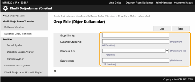 1 | Grup kimliğini ve kullanıcı grubu adını girin. |