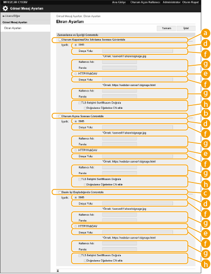 Otomatik Sıfırlama modu başladıktan sonra <Oto Sıfırlama Zamanı> seçeneğini bir dakika daha uzun ayarlayın. Görüntülenebilecek dosya biçimleri ve veri boyutları hakkında bilgi için bkz. Yönetim Fonksiyonları. Bu ayar yalnızca Administrator ayrıcalıklarına sahip bir kullanıcı tarafından belirtilebilir. Bu ayar alınabilir/aktarılabilir. Birden fazla cihazda aynı bildirimi görüntülemek için aynı ayar birden fazla cihaza alınabilir (yalnızca Görsel Mesaj fonksiyonunu destekleyen Canon cihazları) . Ayar Verilerini İçeri/Dışarı Aktarma [File Path:] bu ayarla alınır/aktarılır. Gelişmiş Alan içindeki bir dosya belirtilirse ve dışa aktarma işlemi yapılan makinede görüntülenirse, aşağıdaki işlemlerden birini gerçekleştirin: Dışa aktarma işlemi yapılan makinenin Gelişmiş Alan alanındaki dosyayı, içe aktarma işlemi yapılan makinenin Gelişmiş Alan alanına manuel olarak kopyalayın. [File Path:] öğesini, dosyanın mevcut olduğu konumun yolu olacak şekilde değiştirin. Oturum açma işlemleri gerçekleştirecekseniz Görsel Mesaj ekranını kapattıktan sonra gerçekleştirin. Makinede Oturum Açma Kopya Kartı Okuyucusu takılıysa içerik görüntülenmez. |