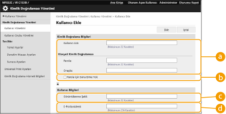 Kumanda paneli üzerinden ayarları yapılandırma (Ayarlar/Kayıt) <Yönetim Ayarları> <Kullanıcı Yönetimi> <Kimlik Doğrulama Yönetimi> <Kimlik Doğrulama Kullanıcısını Kaydet/Düzenle> seçeneğine basarak da kullanıcı bilgilerini kaydedebilirsiniz. <Kimlik Doğrulama Kullanıcısını Kaydet/Düzenle>Kullanıcı grupları oluşturmaAdres Defteri’ndeki Adres Listeleri, bir kullanıcı grubuna kayıtlı kullanıcılar arasında paylaşılabilir. Kullanıcı Gruplarını Kaydetme |