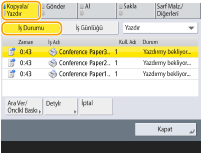 Baskı işleri için bekleme durumunu ve yazdırma sırasında bir hata meydana gelip gelmediğini kontrol edebilirsiniz. Belgeyi diğer belgelerde önce yazdırma ve yazdırmayı geçici olarak askıya alma veya iptal etme gibi işlemler de yapılabilir.