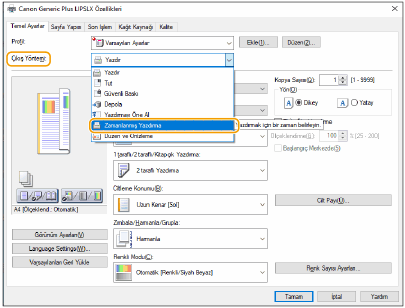 ![]() | Yazdırmaya başlamak için zamanı belirleyebilirsiniz. Bu, gece büyük miktarlarda belge yazdırırken vb. kullanışlıdır. |