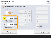 בחר <X> או <Y>, כדי להזין את האורך כל צד באמצעות מקשי הספרות. ![]() אם תרשום את גודל הנייר שבו אתה משתמש לעתים תכופות בלחצנים <S1> עד <S4>, תוכל להשתמש בהם בלחיצה פשוטה. רישום נייר בגודל חופשי (גודל נייר מותאם אישית) | |