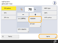 | | ניתן לבצע הגדלה או הקטנה לשם התאמה אוטומטית לגודל הנייר שנבחר. הגדלה או הקטנה של עותקים לצורך התאמה לגודל הנייר.