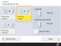 כדי לציין את כיוון המסמך ולשנות את כיוון ההדפסה, לחץ על <הגדרת פרטים>. בחר סוג <סוג ספר> כאשר הכיוון של החלק הקדמי והאחורי של המסמך זהה. בחר <סוג לוח שנה> כאשר הכיוון של החלק הקדמי והאחורי אינו זהה. ניתן גם להגדיר את כיוון הדף של הפלט באמצעות <סוג ספר> או <סוג לוח שנה>.