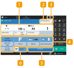 מציג סטטוס הגדרות כגון יחס צילום מותאם אישית, גודל נייר, ומספר צילומים. הקפד לאשר את ההגדרות כדי לצלם כראוי. כדי לשנות את ההגדרות, לחץ על הלחצן שבתחתית אזור התצוגה. פעולות צילום בסיסיות