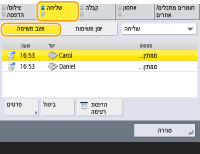 לחיצה על <פרטים> <שליחה חוזרת> מאפשרת לשלוח שוב את המסמכים ששליחתם נכשלה. כדי לציין יעד אחר, לחץ על <שינוי יעד>. עבור מסמכים עם יעדים מרובים שצוינו באמצעות אותה שיטת שליחה, לחץ על <רשימת שידור>, בחר יעד ולאחר מכן לחץ על <שליחה חוזרת> או על <שינוי יעד>.ניתן לשלוח שוב מסמכים כאשר האפשרות <מחיקת משימות שידור שנכשלו> מוגדרת כ-<כבוי> (<מחיקת משימות שידור שנכשלו>). שים לב כי לא ניתן לשלוח שוב מסמכים שנשלחו באמצעות שליחה ישירה/שליחה ידנית/שליחת פקס ממחשב. ניתן לשנות את היעדים של מסמכים המוגדרים להישלח בזמן מסוים, וכן את היעדים של מסמכים ששליחתם נכשלה. שים לב כי אינך יכול לשנות את היעדים של מסמכים שצוינו להם יעדים מרובים ונמצאים בתהליך של שליחה, או כאשר ישנה הגבלה על הזנת יעד חדש (Limiting Available Destinations). ניתן לשנות את היעד עבור משימה שבוטלה עקב שגיאות שידור, או עבור משימה הממתינה להישלח במצב 'שליחה מושהית'. לא ניתן לשנות יעדים מרובים בפעם אחת. כמו כן, לא ניתן לשנות את היעדים בקבוצה בפעם אחת. |