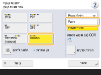 1 | בחר <OOXML> בחר <Word> f מהרשימה הנפתחת.![]() ![]() לשינוי השפה לשימוש ב-OCR, לחץ על <הגדרת פרטים> <שינוי> בחר שפה או קבוצת שפות לחץ על <אישור>. |