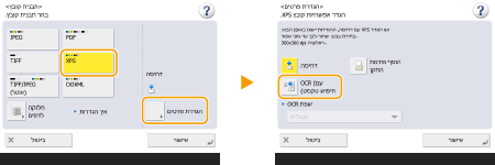 ![]() | מצב זה מאפשר לבצע OCR (זיהוי תווים אופטי) על מנת לחלץ נתונים שניתן לזהותם כטקסט מתוך התמונה הנסרקת, וליצור קובץ PDF/XPS/OOXML (pptx/docx) שניתן לחפש בו. ניתן גם להגדיר את האפשרות <דחיסה> במידה שאתה בוחר PDF או XPS בתור תבנית הקובץ. |
