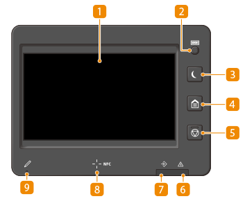 فشار دهید تا صفحه خانه نمایش داده شود، که امکان دسترسی به منوی تنظیمات و عملکردهایی نظیر کپی و اسکن را فراهم میآورد.