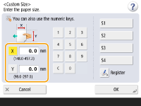 <X> یا <Y> را فشار دهید و طول هر طرف را با استفاده از کلیدهای عددی وارد کنید. ![]() اگر اندازه کاغذ پرکاربرد را روی دکمه های <S1> تا <S4> ثبت کنید، می توانید آنها را با یک فشار ساده فراخوانی کنید. ثبت کاغذ با اندازه دلخواه (کاغذ با اندازه سفارشی) | |