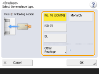 1 | <Envelope> را فشار دهید. نوع کاغذ پاکت نامه را نمی توان از صفحه جزئیات <Paper Type> انتخاب کرد. برای انتخاب نوع کاغذ پاکت نامه، نوع کاغذ را در <Register Favorite Paper (Multi-Purpose Tray)> ثبت کنید، سپس <Favorite Paper> را در مرحله 2 فشار دهید دکمه ای که نوع کاغذ پاکت نامه روی آن ثبت شده است <OK>. ثبت اندازه و نوع کاغذ پرکاربرد برای سینی چند منظوره |