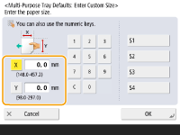 <X> یا <Y> را فشار دهید و طول هر طرف را با استفاده از کلیدهای عددی وارد کنید. ![]() اگر اندازه کاغذی را که اغلب استفاده می کنید روی دکمه های <S1> تا <S4> ثبت کنید، می توانید با یک لمس آنها را فراخوانی کنید. ثبت کاغذ با اندازه دلخواه (کاغذ با اندازه سفارشی) | |