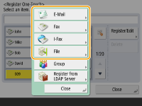 مقصدهایی که در دکمه تک لمسی ثبت می شوند، می تواند در یک گروه ترکیب شود و به عنوان یک مقصد واحد ثبت شود. برای اطلاع از جزئیات به ثبت گروه در دکمه تک لمسی مراجعه کنید. برای تغییر یا حذف اطلاعات مقصد ثبت شده در دکمه های تک لمسی، به ویرایش مقصدهای ثبت شده در دکمه های تک لمسی رجوع کنید. مقصدهای ذخیره شده در دکمه های تک لمسی، در Local Address Book نیز نشان داده می شوند. |