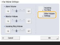 <Alarm Volume>میزان صدای تولیدشده هنگام لغو انتقال فاکس، یا اتمام چاپ فاکس دریافتی را تنظیم کنید. اگر نمی خواهید صدایی تولید شود،