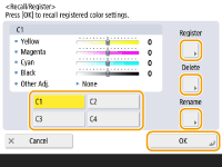 میتوانید حداکثر تا چهار تنظیمات را پس از انجام تنظیم، ثبت کنید. پس از تنظیم رنگ، <Recall/Register> را فشار دهید یک دکمه از <C1> تا <C4> انتخاب کنید گزینه <Register> <Yes> <OK> را فشار دهید.![]() ![]() برای فراخوانی تنظیمات ثبتشده، <Recall/Register> را فشار دهید، دکمهای را انتخاب کنید و سپس <OK> را فشار دهید. میتوانید نام دکمههای <C1> تا <C4> را تغییر دهید. دکمهای را که مایل به تغییر آن هستید انتخاب کنید، <Rename> را فشار دهید و سپس یک نام جدید وارد کنید. برای حذف تنظیمات ثبتشده، دکمه را انتخاب کنید و <Delete> <Yes> را فشار دهید. |