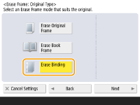 1 | <Erase Book Frame> را فشار داده و <Original Size>را تأیید کنید. ![]() اگر اندازه نمایش داده شده در <Original Size> متفاوت از اندازه کتابی است که تنظیم کرده اید، <Change> را برای انتخاب اندازه فشار دهید. |