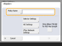 صرف نظر از تنظیم <Format Encryption Method to FIPS 140-2> برای ارتباط IPSec، ماژول رمزگذاری که قبلاً گواهی FIPS140-2 کسب کرده است، استفاده خواهد شد. برای اینکه ارتباط IPSec را به گونه ای تنظیم کنید که از FIPS 140-2 پیروی کند، باید طول کلید DH و RSA را برای ارتباط IPSec تا 2048 بیت یا بیشتر در محیط شبکه که دستگاه به آن تعلق دارد، تنظیم کنید. فقط طول کلید برای DH را می توان از دستگاه مشخص کرد. هنگام پیکربندی محیط مراقب باشید زیرا هیچ تنظیمی برای RSA در دستگاه وجود ندارد. می توانید تا 10 خط مشی امنیتی ثبت کنید. |