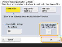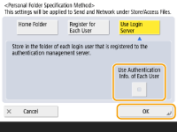 3 | اطلاعات تأیید اعتبار را برای استفاده انتخاب کنید و <OK> را فشار دهید. برای استفاده از نام کاربر و کلمه عبور مجزا برای پوشه شخصی، <Use Authentication Info. of Each User> را برای افزودن علامت تأیید فشار دهید. برای استفاده از همان نام کاربر و کلمه عبور وارد شده در ورود به سیستم، علامت تأیید را حذف کنید. اگر علامت تأییدی به این مورد اضافه شود، باید نام کاربر و کلمه عبور برای هر کاربر ثبت کرد. ![]() با نام های زیر، پوشه ای در پوشه اصلی ایجاد می شود. اگر علامت تأییدی به <Use Authentication Info. of Each User> اضافه شود: نام کاربر مشخص شده توسط کاربر اگر علامت تأییدی به <Use Authentication Info. of Each User> اضافه نشود: نام کاربر استفاده شده برای ورود به سیستم |