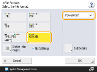 1 | گزینه <OOXML> را انتخاب کنید گزینه <PowerPoint> را از لیست کشویی انتخاب کنید.![]() ![]() برای انتخاب زبان مورد استفاده در OCR، روی <Set Details> <Change> فشار دهید زبان را انتخاب کنید روی <OK> فشار دهید. |