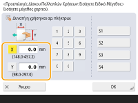 Πατήστε <X> ή <Y> για να εισαγάγετε το μήκος κάθε πλευράς, χρησιμοποιώντας τα αριθμητικά πλήκτρα. ![]() Αν καταχωρήσετε το μέγεθος του χαρτιού που χρησιμοποιείτε συχνά στα πλήκτρα <S1> έως <S4>, μπορείτε να τα εμφανίζετε με το πάτημα ενός πλήκτρου. Καταχώρηση χαρτιού ελεύθερου μεγέθους (Χαρτί προσαρμοσμένου μεγέθους) | |