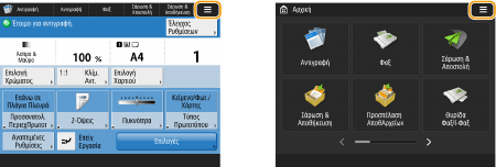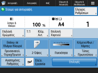 Πατήστε το που εμφανίζεται στην οθόνη <Αρχική> και στην οθόνη βασικών λειτουργιών για να πραγματοποιήσετε αλλαγές στην οθόνη, όπως επαναρρύθμιση πλήκτρων ή δημιουργία πλήκτρου συντόμευσης. Προσαρμογή της οθόνης αφής![]() Μπορείτε να αλλάξετε τις ρυθμίσεις σχετικά με την εμφάνιση της οθόνης, όπως να καθορίσετε ποια οθόνη θα εμφανίζεται αμέσως μετά την ενεργοποίηση της συσκευής και αν θα εμφανίζεται το μήνυμα για την εναπομένουσα ποσότητα χαρτιού και γραφίτη. <Ρυθμίσεις Εμφάνισης> Μπορείτε να ορίσετε την οθόνη που θα εμφανίζεται όταν έχει περάσει κάποιο χρονικό διάστημα χωρίς εκτέλεση κάποιας λειτουργίας. <Λειτουργία μετά από Αυτόματη Επαναφορά> |