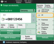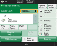 Έλεγχος του συνολικού αριθμού των καθορισμένων προορισμώνΟ συνολικός αριθμός προορισμών που καθορίσατε εμφανίζεται στην επάνω περιοχή της οθόνης. Αυτό σας δίνει τη δυνατότητα να ελέγξετε ότι ο αριθμός των προορισμών είναι σωστός πριν από την αποστολή. ![]() Αποστολή με τις πληροφορίες αποστολέαΜπορείτε να πραγματοποιείτε αποστολή με τις πληροφορίες και τον αριθμό φαξ του αποστολέα. <Ταυτότητα Τερματικού ΑΠ> Για να ελέγξετε τις καταστάσεις για απεσταλμένα έγγραφαΣτην οθόνη <ΈλεγχοςΚατάστ>, μπορείτε να ελέγξετε τις καταστάσεις για απεσταλμένα έγγραφα. Αυτή η οθόνη σάς δίνει τη δυνατότητα να αποστείλετε ξανά τα φαξ ή να ακυρώσετε την αποστολή αφού ελέγξετε τις καταστάσεις. Έλεγχος Κατάστασης και Ημερολογίου για Εξερχόμενα και Εισερχόμενα Έγγραφα Όταν το <Εμφάν. Ειδοποίησης Κατά την Αποδοχή της Εργασίας> έχει ρυθμιστεί στο <On>, η ένδειξη <ΈλεγχοςΚατάστ> εμφανίζεται στην ακόλουθη οθόνη μετά τη λήψη μιας απεσταλμένης εργασίας. <Εμφάν. Ειδοποίησης Κατά την Αποδοχή της Εργασίας> ![]() Όταν παρουσιαστεί σφάλμα αποστολής επειδή η γραμμή του παραλήπτη είναι απασχολημένηΗ συσκευή πραγματοποιεί αυτόματη επανάκληση μετά από ένα ορισμένο χρονικό διάστημα. Μπορείτε να αλλάξετε ρυθμίσεις όπως τον αριθμό επανακλήσεων της συσκευής, καθώς και το διάστημα που θα μεσολαβήσει μεταξύ των επανακλήσεων. <Αυτ. Επανάκληση> Για να εκτυπώσετε την αναφορά αποτελεσμάτων της αποστολήςΣτην οθόνη βασικών λειτουργιών φαξ, αν πατήσετε <Επιλογές> <Αναφορά Αποτελέσματος ΑΠ> θα έχετε τη δυνατότητα αυτόματης εκτύπωσης της αναφοράς αποτελεσμάτων της αποστολής.Για να ρυθμίσετε αυτήν τη λειτουργία για κάθε εργασία από το <Επιλογές>, πρέπει να επιλέξετε <Μόνο για Σφάλματα> ή <Off> στο <Αναφορά Αποτελέσματος ΑΠ> και, στη συνέχεια, να ρυθμίσετε το <Επιτρέπεται Εκτύπωση από Επιλογές> σε <On>. Όταν οι φωτογραφίες στην απεσταλμένη εικόνα είναι πολύ σκούρες ή φωτεινές, τα χρώματα στο φόντο των έγχρωμων πρωτότυπων δεν μπορούν να αφαιρεθούνΗ ποιότητα της απεσταλμένης εικόνας μπορεί να βελτιωθεί εάν πληρούνται οι ακόλουθες προϋποθέσεις/ρυθμίσεις. Τύπος εργασίας: Φαξ (Αποστολή μέσω μνήμης) ή Σάρωση και Αποστολή (Φαξ/I-Φαξ) <ΕπιλογήΧρώματος>: <Άσπρο & Μαύρο> (Σάρωση και Αποστολή) <Τύπος Πρωτοτύπου>: <Κείμενο> <Πυκνότητα> <Πυκνότητα Φόντου>: <Αυτ.><Ανάλυση>: 200 dpi x 400 dpi, 300 dpi x 300 dpi*, 400 dpi x 400 dpi, ή 600 dpi x 600 dpi* *Μπορεί να ρυθμιστεί για σάρωση και αποστολή <Προτερ.Ταχύτητας/Ποιότητας Εικόνας για Α&Μ Σάρωση> Εργασίες Αποστολής Φαξ/I-Φαξ: <Προτεραιότ. Ποιότητας> (<Προτερ.Ταχύτητας/Ποιότητας Εικόνας για Α&Μ Σάρωση>) |