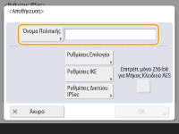 Ανεξάρτητα από τη ρύθμιση του <Διαμόρφ.Μεθόδου Κρυπτογράφ.σε FIPS 140-2> για την επικοινωνία IPSec, θα χρησιμοποιηθεί μονάδα κρυπτογράφησης που έχει ήδη λάβει πιστοποίηση FIPS140-2. Προκειμένου η επικοινωνία IPSec να συμμορφώνεται με το FIPS 140-2, θα πρέπει να ορίσετε το μήκος του DH και του RSA για επικοινωνία IPSec σε 2048-bit ή παραπάνω στο περιβάλλον δικτύου όπου ανήκει η συσκευή. Μόνο το μήκος κλειδιού για το DH μπορεί να οριστεί από τη συσκευή. Προσέξτε όταν διαμορφώνετε το περιβάλλον σας, καθώς δεν υπάρχουν ρυθμίσεις για RSA στη συσκευή. Μπορείτε να καταχωρίσετε έως και 10 πολιτικές ασφαλείας. |