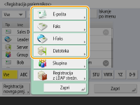 ![]() | Registrirate lahko prejemnikovo številko faksa ali e-poštni naslov, ki se lahko uporabi pri pošiljanju optično prebranih dokumentov v imeniku. Prav tako lahko kot cilj registrirate cilj za i-faks, mesto mape v datotečnem strežniku (naslov IP in pot) in shrambo (Izpopolnjeni prostor) Canonovega večnamenskega tiskalnika v imeniku. |