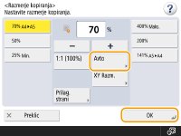 | | Kopije lahko povečate ali pomanjšate tako, da se samodejno prilegajo izbrani velikosti papirja. Povečanje in pomanjšanje kopij glede na velikost papirja