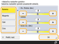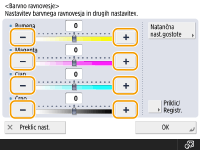 Po prilagoditvi lahko registrirate do štiri nastavitve. Po prilagoditvi barve pritisnite <Priklic/Registr.> izberite gumb od <C1> do <C4> pritisnite <Registracija> <Da> <OK>.![]() ![]() Za priklic registriranih nastavitev pritisnite <Priklic/Registr.>, izberite gumb in pritisnite <OK>. Imena gumbov od <C1> do <C4> lahko spremenite. Izberite gumb, ki mu želite spremeniti ime, pritisnite <Preimenovanje> in vnesite novo ime. Če želite izbrisati registrirane nastavitve, izberite gumb pritisnite <Brisanje> <Da>. |