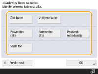 Izberete lahko več vrst kakovosti slike hkrati. Možnosti <Žive barve> in <Umirjene barve> ni mogoče izbrati hkrati. Enako velja za možnosti <Posvetlitev slike>, <Potemnitev slike> in <Poudarek reprodukcije>.