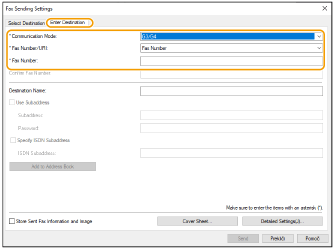 Če je v pogovornem oknu [Security Settings] nastavljena možnost [Confirm Fax Number/URI when Setting Destination], vnesite želeno številko faksa v polje [Confirm Fax Number]. Za podrobnosti si oglejte pomoč za gonilnik faksa.
