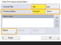 Možnost <Uporabi filter> nastavite na <Da>, izberite <Privzeta politika>, nato pritisnite <Registracija>.