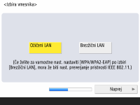 Navedite način vzpostavljanja povezave naprave z omrežjem. ![]() ![]() Izberete lahko način povezave naprave z računalniki in drugimi napravami. Izberite želeni način povezave in pritisnite <Naprej>. Če ste izbrali <Ožičeni LAN>, nadaljujte s 7. korakom. Več podrobnosti o načinih povezave z omrežjem si lahko ogledate v razdelku Izbira načina vzpostavljanja povezave z omrežjem. ![]() Če ste izbrali <Brezžični LAN>, navedite nastavitve brezžičnega lokalnega omrežja. ![]() Več podrobnosti o povezovanju z brezžičnimi omrežji si lahko ogledate v razdelku Povezava z brezžičnim omrežjem LAN. | |