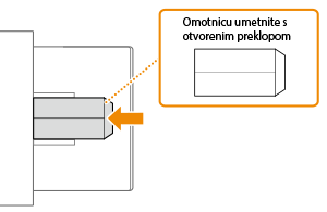 U ovom dijelu opisuje se u kojem smjeru uložiti omotnice, kao i postupci koje treba izvršiti prije nego omotnice uložite. Opis općenitog postupka umetanja papira u višenamjenski odlagač potražite u Osnovni načini umetanja papira. |