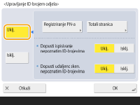 Provjerite jesu li postavljeni ID-brojevi odjela za korisnike registrirane na uređaju. Registriranje podataka uređaja na lokalnom uređaju Upravljanje ID-brojevima odjela valjano je samo za korisnike koji su registrirani na lokalnom uređaju. Ako ste prijavljeni kao korisnik s administratorskim ovlastima, ID i PIN upravitelja sustava automatski će vam se dodijeliti i njima će se upravljati kao ID-brojevima odjela. U slučaju aktivacije Upravljanja ID-brojem odjela putem izbornika Čitač kartica za kopiranje, upotrebljavat će se ID-brojevi odjela dodijeljeni karticama. Stoga nećete moći registrirati ID-brojeve odjela. |