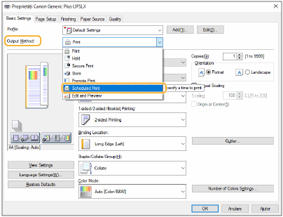 Selectaţi [Scheduled Print] pentru [Output Method].