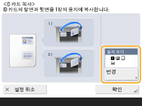 ![]() | 이 기능을 사용하면 ID 카드의 앞면과 뒷면을 종이 한 장에 복사할 수 있습니다. 이 기능은 운전 면허증과 같은 ID 카드(신분증)를 복사할 때 유용합니다. ID 카드 양쪽 면의 이미지 방향과 인쇄 위치가 용지 크기에 맞게 자동으로 정렬되기 때문입니다. |