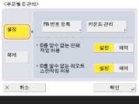 기기에 등록된 사용자에 대해 부서 ID가 설정되어 있는지 확인합니다. 로컬 장치에 사용자 정보 등록하기 부서 ID 관리자는 로컬 장치에 등록되어 있는 사용자에 대해 항상 유효합니다. 관리자 권한이 있는 사용자로 로그인하는 경우 시스템 관리자 ID와 PIN이 자동으로 할당되고 부서 ID로 관리됩니다. |
