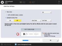 When the machine is turned ON for the first time (Turning ON the Machine), the initial setup of the machine begins automatically. You can adjust the basic setup necessary to use the machine. Configure the basic setup in accordance with each screen, or click a link to display the corresponding page and see details.