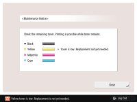 The following warning screen is displayed. ![]() If you press <Close> on the warning screen to close the screen, you can perform normal operations. However, the warning screen will appear every time the machine returns from sleep mode or when the main power is turned ON. If you have already prepared a new toner cartridge, etc., and the notification becomes unnecessary, perform the <Delete Remaining Toner Error> operation. The message indicating the status remains on the bottom of the screen, regardless of this setting. |