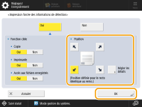 Appuyez sur les touches fléchées pour sélectionner la position d'impression. Pour ajuster précisément la position, appuyez sur <Régler les détails> et spécifiez la position.
