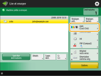Pour sélectionner un destinataire à partir de l'écran <1 touche> après la numérisation, sélectionnez <1 touche> pour <Ecran par défaut>. Cela permet de simplifier la procédure pour envoyer des documents numérisés à un même destinataire. <Ecran par défaut> Les destinations enregistrées dans les boutons 1 touche de l'appareil serveur sont mises à jour aux occurrences suivantes : Lorsqu'une tâche de télécopie a été envoyée sur l'appareil client Si vous appuyez sur (Réinitialiser) sur l’appareil clientLorsque la réinitialisation automatique est activée sur l'appareil client |