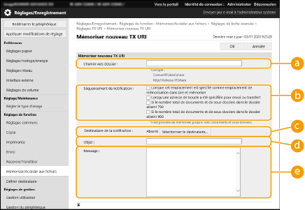 Une notification est envoyée chaque fois qu'un fichier est enregistré dans le dossier spécifié à l'intérieur de l'Espace avancé depuis une adresse de bouclage (une adresse qui indique cet appareil sur un réseau) en utilisant la fonction Envoi ou Transfert. Toutefois, une notification n'est pas envoyée lorsqu'un fichier est enregistré dans un sous-dossier ou qu'un dossier est ajouté à un sous-dossier. Spécifiez une adresse de bouclage lorsque l'Espace avancé de l'appareil est utilisé comme destination pour <Lire et Envoyer> ou <Réglages de transfert>. Enregistrement de destinataires dans le carnet d'adresses