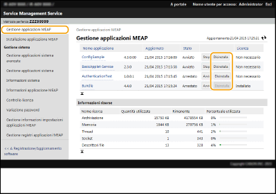 Se si fa clic sul nome di un'applicazione MEAP, saranno visualizzate le informazioni dettagliate come il nome dell'azienda e la percentuale di utilizzo della memoria per ciascuna applicazione. Da qui viene eseguita la gestione della licenza. Gestione delle licenze delle applicazioni MEAP