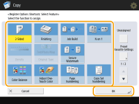 È possibile modificare i pulsanti di impostazione visualizzati nelle schermate Funzioni di base (per copia, fax e scansione) con altri pulsanti di impostazione in <Opzioni>. Disponendo i pulsanti relativi alle impostazioni usate frequentemente nella schermata Funzioni di base, è possibile usare le funzioni in modo più efficiente. Inoltre, accedendo con la gestione dell'autenticazione personale, è possibile visualizzare una schermata Funzioni di base diversa, personalizzata per ogni utente.