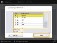 Pulse <Especificar por nombre servicio> para utilizar nombres de servicio al especificar los puertos a los que se aplica IPSec. Seleccione el servicio en la lista, pulse <Activ./Desac. servicio> para activarlo (<Sí>) y pulse <Aceptar>.