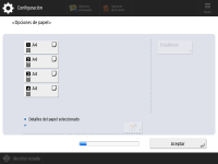 Compruebe que el papel cargado en los casetes está bien especificado. ![]() ![]() Si los tamaños del papel son correctos, pulse <Aceptar>. Para obtener información en pantalla e instrucciones sobre cómo cambiar las opciones, consulte Especificación del tamaño y tipo de papel en el casete. Si no ha iniciado sesión como administrador, continúe con el paso 10. | |