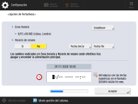 Especifique la fecha y hora del equipo. ![]() ![]() Introduzca la fecha y la hora, y pulse <Aceptar>. Configure <Zona horaria> y <Horario de verano> según proceda. Para obtener más información, consulte Configurar la fecha/hora. | |