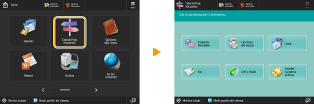 Pulse <Tutorial/Preg.frecuentes> para ver una pantalla que explica lo que puede hacer con las funciones del equipo, así como consejos de uso de la copiadora, el escáner, etc. Puede ver esta pantalla cuando desee saber más sobre las funciones disponibles y cómo utilizarlas. También puede acceder a la página de preguntas frecuentes desde un dispositivo móvil.